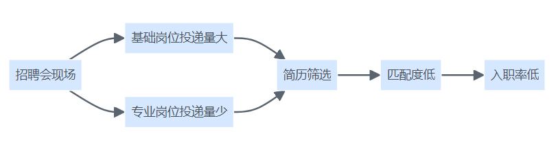 招聘会整体流程与效果问题分析图,展示基础与专业岗位投递量、筛选与入职率之间的关联。