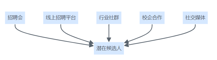 企业招聘多渠道信息流动结构图,展示线下招聘会与多种线上渠道共同作用于潜在候选人。