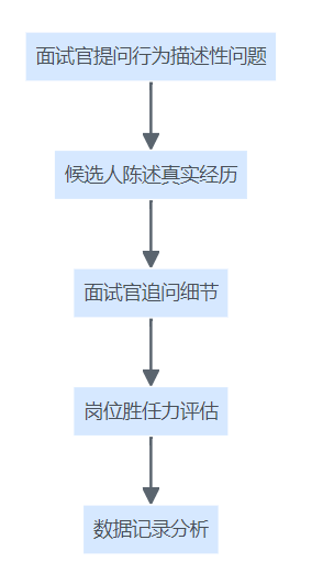 行为描述性面试流程图,展示从提问、陈述、追问、评估到数据分析的标准化流程。