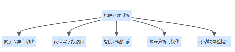 招聘管理系统功能模块示意图,展示自动化、智能匹配、数据分析与移动端支持的系统架构。