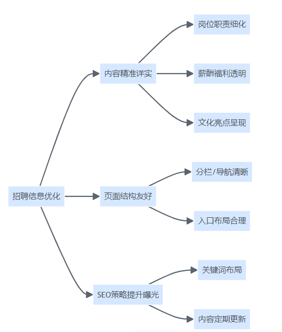 招聘信息优化结构图,涵盖内容精准、页面结构、SEO策略三大要素及其关键举措。
