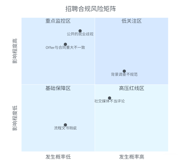 招聘中的合规风险并不都是同一量级。笔者在与多家企业讨论时,常用一个简单的风险矩阵帮助管理层聚焦——一类是发生频率高但单次损失相对可控,一类是即便发生概率不高,但一旦踩上,损害巨大。具体来说,这可以用一个象限图示意不同类型风险的位置: