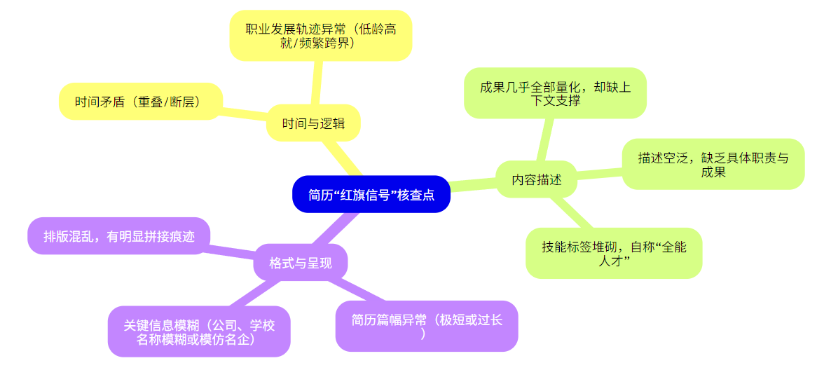 经验丰富的HR会在脑中有一个“红旗信号库”,看到一些典型特征就会提高警惕,而如果把这些经验固化为组织层面的清单,新手也可以快速上手。更进一步地说,比较常见“红旗信号”可以围绕三个维度梳理:时间逻辑、内容描述、格式呈现。
