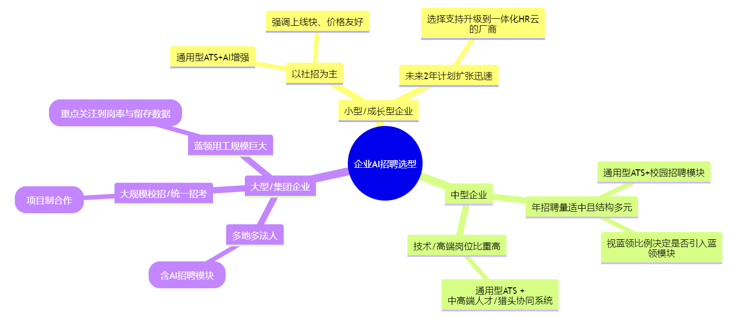 | 校园/批量招聘型 | 支撑大规模统一招考、笔面试 | 报名系统、在线测评、AI笔试阅卷、AI视频面试、批量排名 | 多按项目规模/场次计费,旺季成本较高 | 需要大规模校招、社会批量招聘的集团或公用事业 | 批量处理能力强,能显著缩短大规模招聘周期 | 平时常规社招场景使用价值有限 |