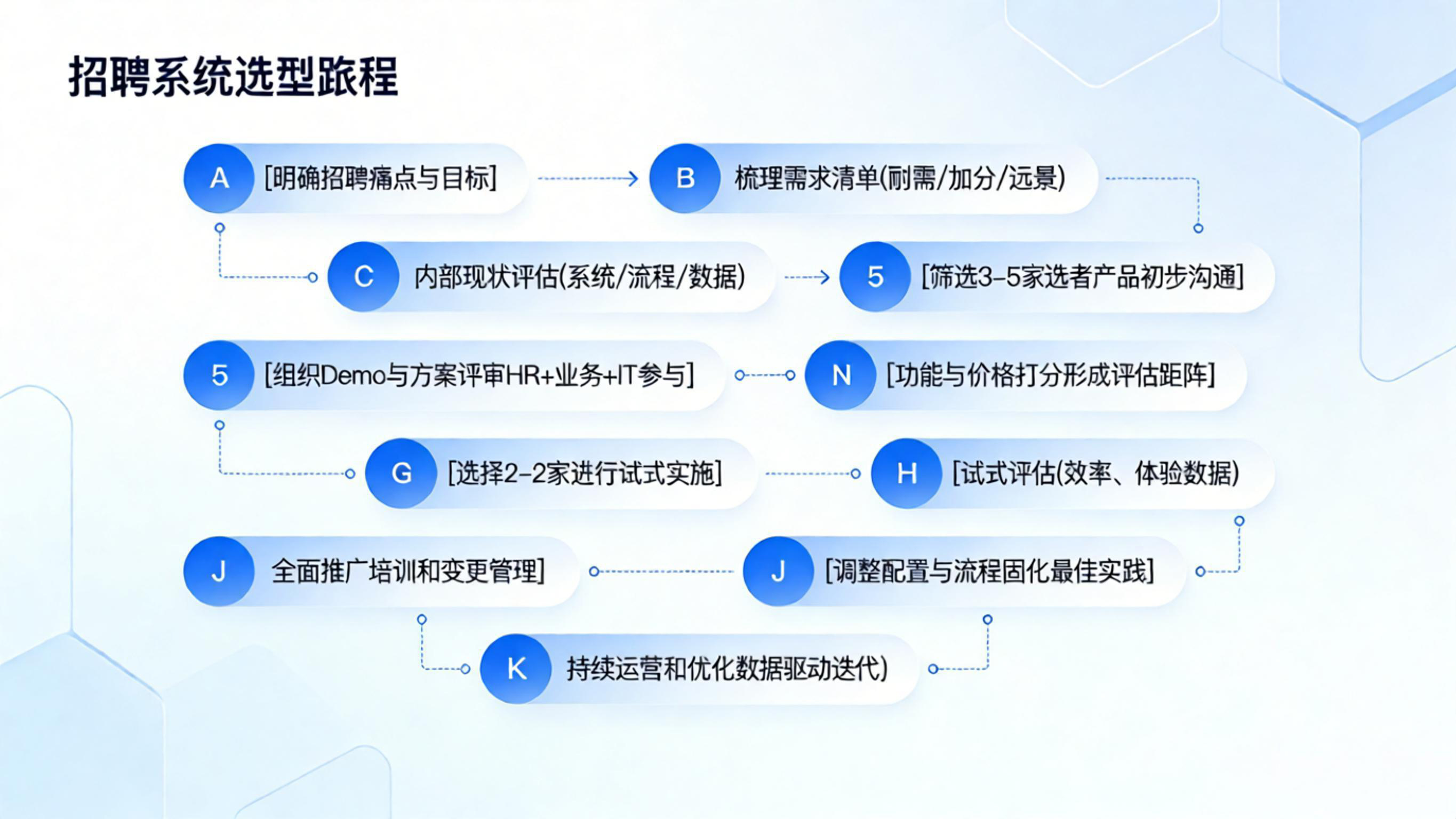 成功的多渠道招聘系统项目,往往遵循同一条路径:问题澄清 → 需求梳理 → 市场调研 → Demo 对比 → 小范围试点 → 全面推广 + 持续运营。