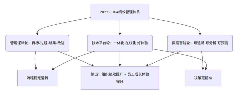 面向2025年,组织形态、工作方式、技术环境都在变:远程协作常态化、AI深入业务、员工更追求成长与公平。PDCA循环绩效管理模式也必须“进化”,从管控导向走向赋能导向,从线下纸面走向数据智能。