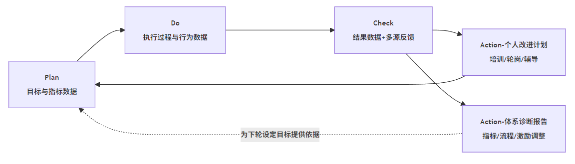 - A(Act:处理/改进)→ 绩效诊断与提升阶段