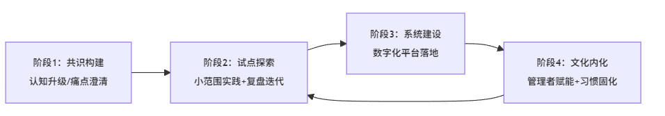 - 转型需要经历共识构建—试点探索—系统建设—文化内化几个循环阶段,而不是一蹴而就。