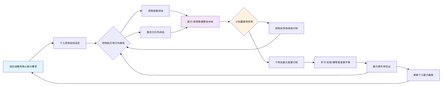 - 发展闭环则将这些洞察沉淀为个体的能力画像,并转化为具体的学习、实践、辅导行动,下一周期再通过绩效与行为表现进行验证与修订。