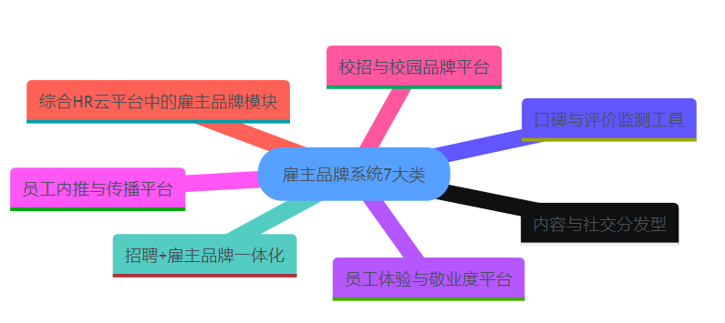 - 理解“7类系统”各有侧重:没有万能产品,只有适配的组合——从招聘一体化,到内容分发、口碑监测、员工体验、内推、校招平台,再到综合HR云平台中的雇主品牌模块。