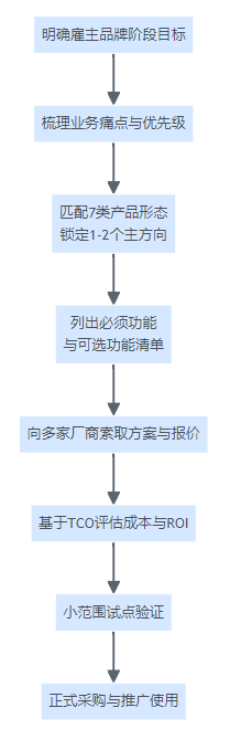 可以参考下面这张选型流程图,把需求、产品形态与预算串起来: