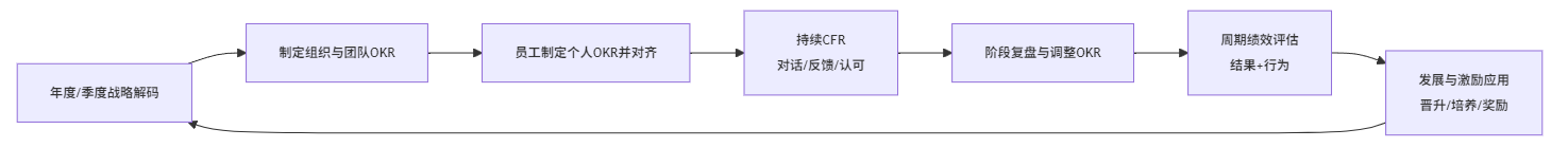 - 从年度KPI+评分,升级为OKR+持续CFR的敏捷‑发展闭环,让目标承载文化,让反馈塑造行为;