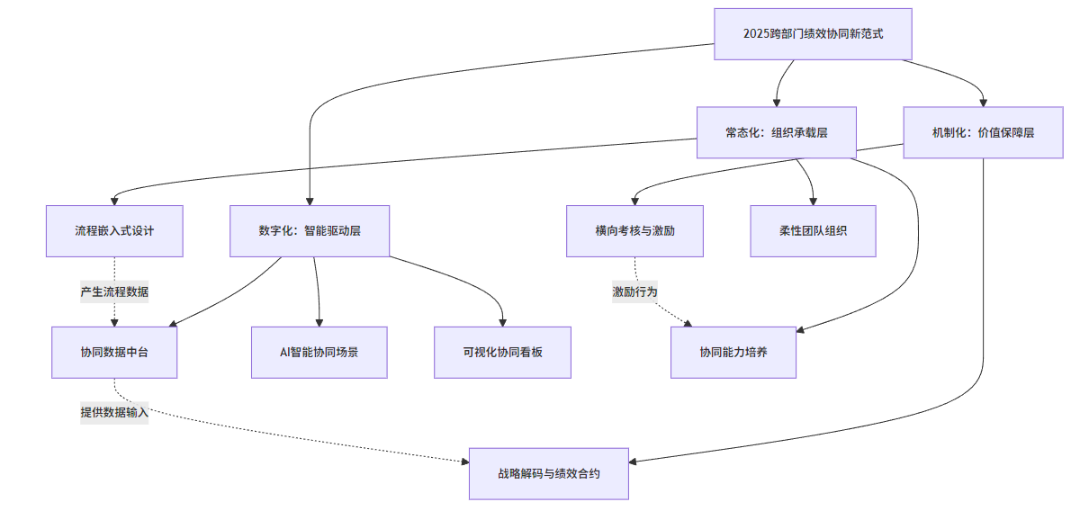 步入2025年前后,AI、数据中台、远程协作等技术与工作方式正在改变协同的底层逻辑——笔者认为,关于“2025年跨部门绩效协同发展方向是什么”这个问题,更准确的表述是:协同正在从一种态度,变成一种可设计、可度量、可训练的组织能力。而在展开细节前,我们先用一张框架图,勾勒2025年的三大新范式。