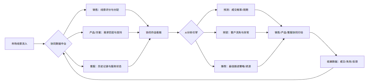 为了让这种数据更有“战斗力”,不少企业会进一步建设类似“可视化作战室”——无论是物理空间,还是虚拟看板,其本质都是“用图形化的方式展示协同进展和风险”,而以“线索到回款”流程为例,我们可以构建如下数据驱动协同流: