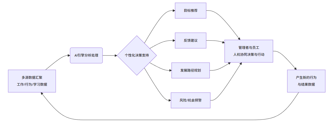 在丰富数据的基础上,AI开始从“工具”升级为“智能助手”,深度嵌入个性化绩效管理的多个关键环节。可以从一个闭环流程来理解: