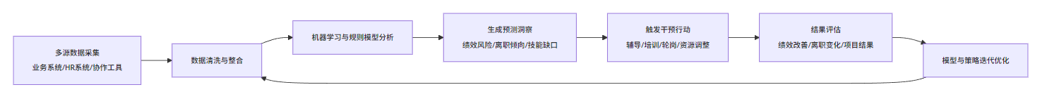 - 对人才队伍:通过历史绩效、学习行为、敬业度调查、流失数据等综合分析,识别可能出现流失或绩效波动的员工,指导HRBP提前介入对话与发展规划。