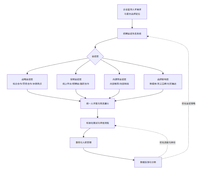 图中的关键含义是所有渠道都不是孤立存在,而应汇聚到统一人才库,经过相对一致的评估流程,最后通过数据反馈反向优化渠道策略和招聘流程。