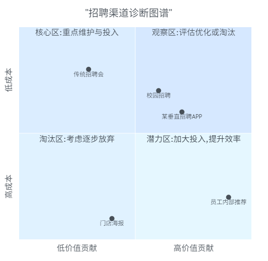 - 核心区:高价值、低成本,如员工内部推荐、自建人才库激活等,应重点维护、持续优化机制。