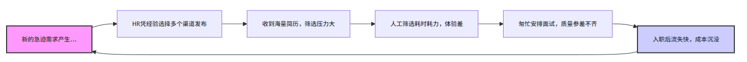 - HR团队本身人手有限,大量时间消耗在机械发布信息、筛简历、约面试上,难以投入到渠道策略优化和雇主品牌建设。