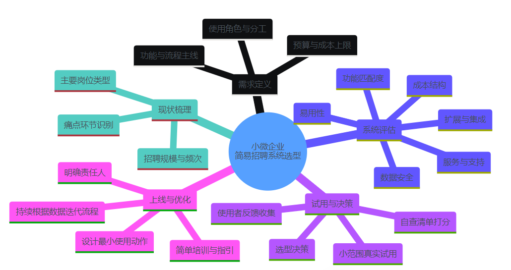 再用一张思维导图式结构,帮助管理者快速回顾“如何选择适合小微企业的简易招聘系统”的完整路径: