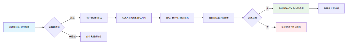 | 效率 | 平均到岗周期 | 相比前期呈缩短趋势 | 简化审批流程,引入AI初筛和候选人自助预约功能 |