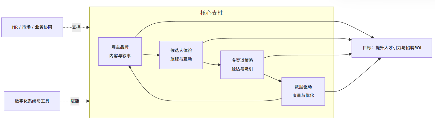 可以看到,这是一个环环相扣的闭环:品牌内容吸引注意 → 候选人体验支撑信任 → 渠道策略扩大覆盖 → 数据驱动反馈优化 → 反哺品牌内容。