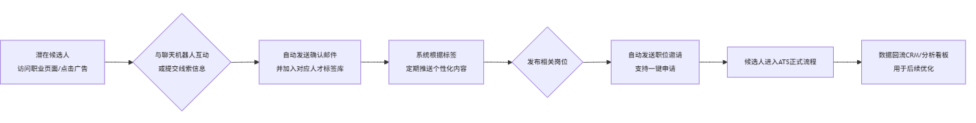 | 招聘CRM | 候选人标签、邮件/短信触达、活动管理 | 人才社区运营、自动化触达 |