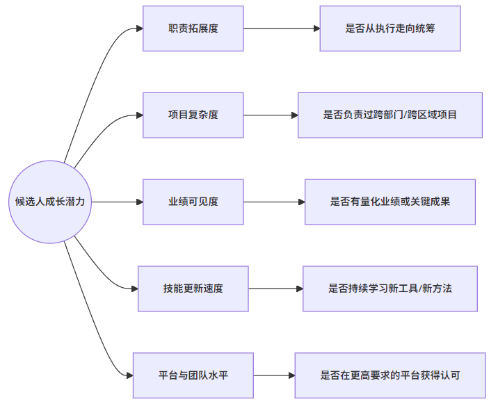 | 稳定性与成长性 | 跳槽轨迹、职责/项目/平台变化趋势 | 5年多次跳槽但时间逐渐拉长、项目愈复杂 | 结合年龄与行业判断,是探索期还是漂移期 |