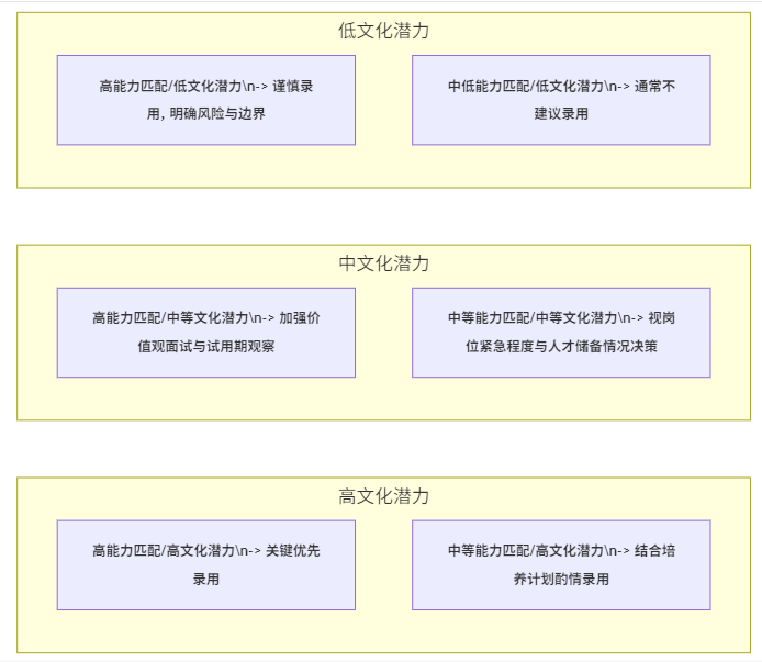 - 使用统一的决策矩阵进行归类,例如以“能力匹配度”和“文化潜力”两个维度绘制九宫格。