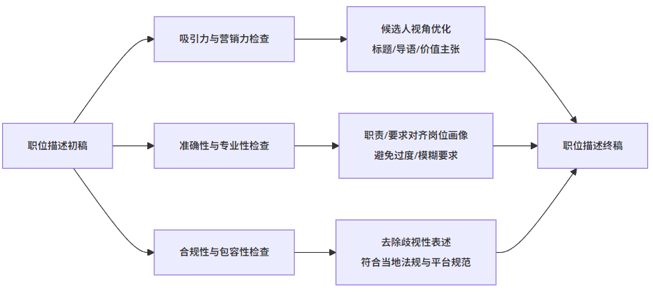 - 标准化模板库:针对不同类型岗位(技术、职能、销售、生产等),形成结构与关键要素相对固定的 JD 模板;
