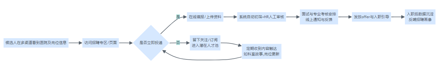 | 候选人体验与转化 | 过程可视、沟通在线化、分层运营 | 流程割裂、信息不透明 | 对年轻医护和高端人才,体验影响决定权 |