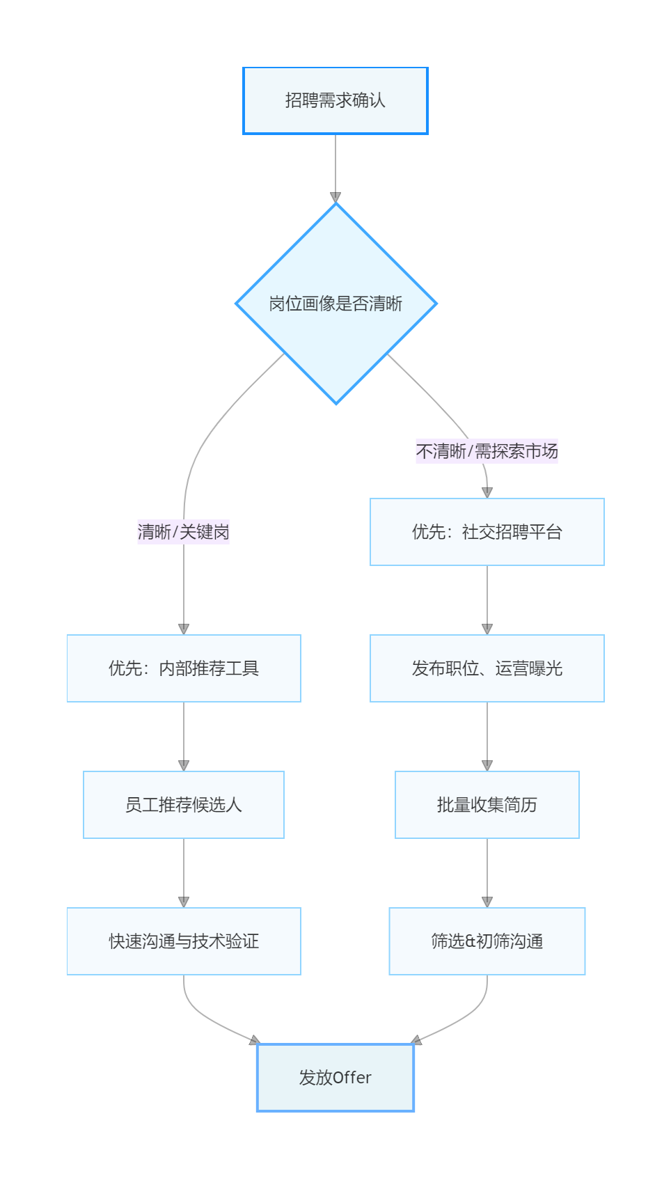 | B类:业务扩张关键岗 | 区域销售、交付顾问 | 社交招聘平台 + 内推并行 | 校园/合作机构 | 重点看地区与行业经验 |