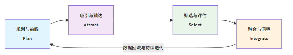 结合实践经验与多篇最佳实践案例(如信息化5P模型、大批量招聘实践、集团企业流程优化案例等),可以将2025版的招聘流程抽象为一个“规划(Plan)– 吸引(Attract)– 甄选(Select)– 融合(Integrate)”的四阶螺旋框架,四个阶段不是一次走完就结束,而是通过“融合与洞察”阶段产生的数据和反馈,反向推动下一轮“规划与前瞻”的优化,实现螺旋式上升。