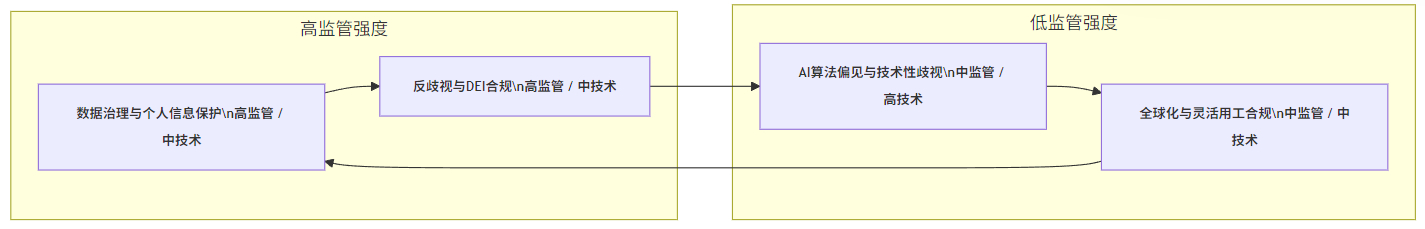 下面用一个示意图帮助梳理四大挑战在“监管强度”和“技术影响度”两个维度上的位置,便于HR团队内部沟通优先级。