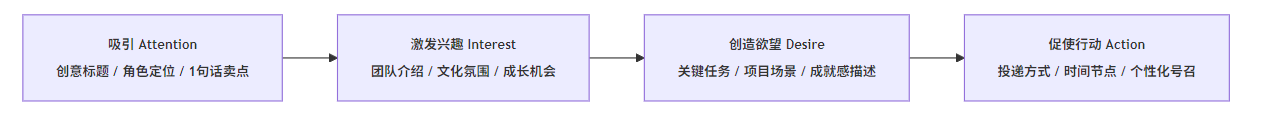 | A 吸引 | 抓住注意力,让目标候选人停下来 | 职位名称、关键词、价值亮点 | 标题包含“职位+领域+1个亮点”;避免自嗨型职称;开头2–3句直接说清差异点 | 优秀:数据分析实习生(Python)|参与核心业务报表,优秀者可转正 vs 待改进:招聘实习生若干 |