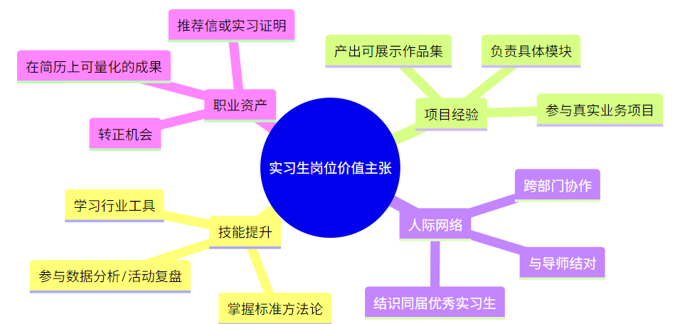 对于实习生,“我能成长成什么样的人”比“公司多么牛”更重要,为此企业可以按照时间顺序或能力维度简单画出一条成长路径: