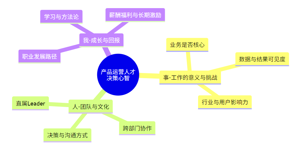 从大量面试交流、离职访谈和行业报告中,笔者发现,产品运营人在评估一份工作时,大致会围绕三个层面权衡:事、人、我。
