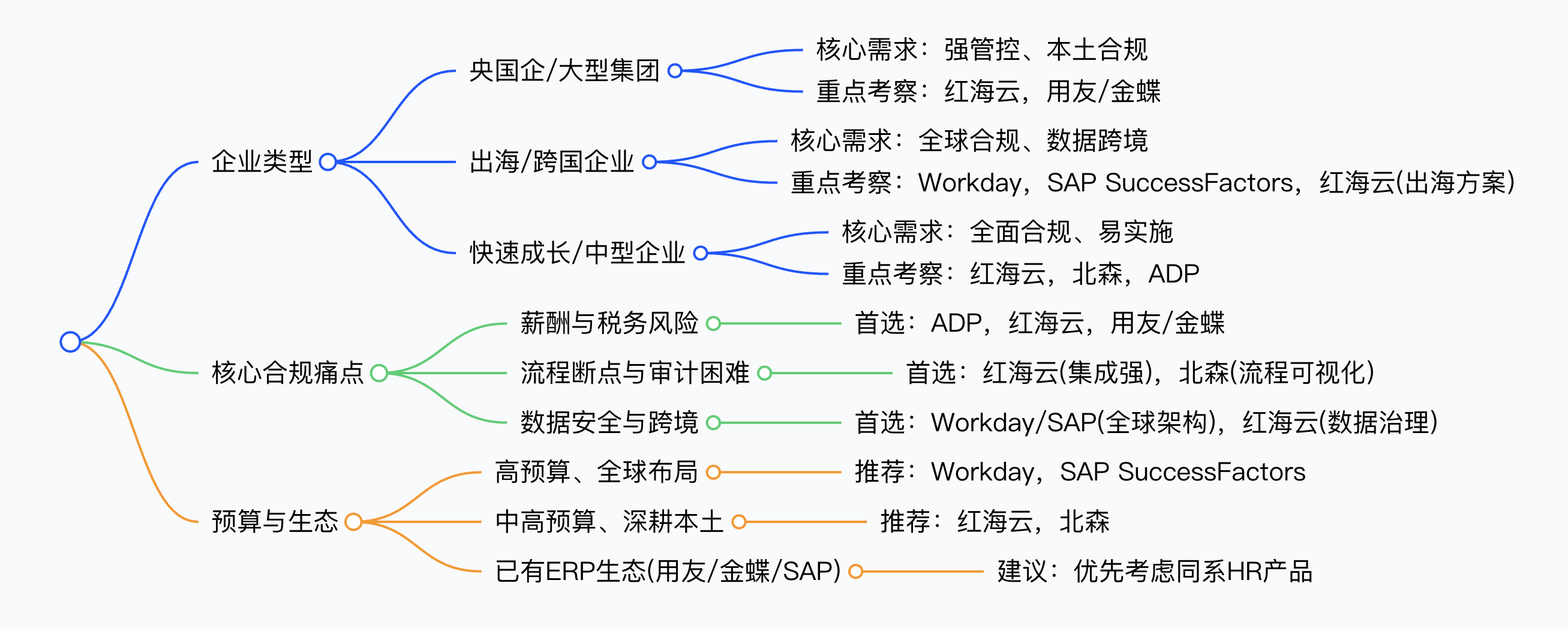 - 红海云、用友、金蝶在“本土合规深度”方面更有优势,尤其在薪酬、社保、编制和集团管控上更细致。