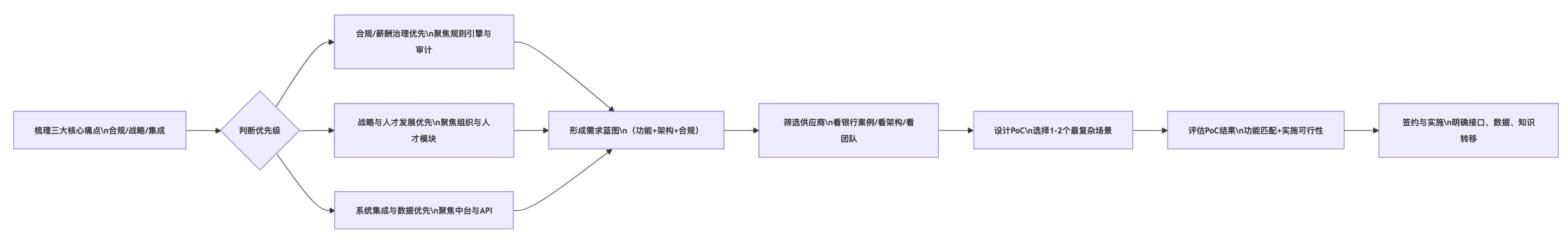 结合以上提到的痛点与案例,可以将银行HR系统的选型与落地过程,抽象为一条决策路径。
