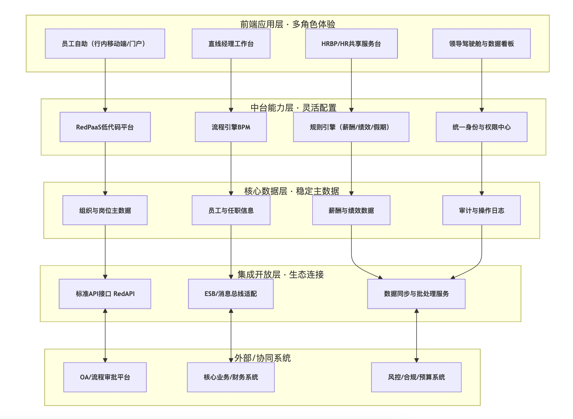 从架构上看,红海云的人力资源管理系统是以“人力数据中台+业务应用+开放平台”三层为核心设计的,这与银行整体“中台+ESB+微服务”的技术路线天然契合。