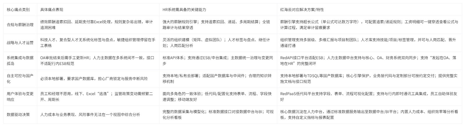 可以先从痛点出发,看看“银行HR核心痛点—系统能力—红海云方案”的映射关系。