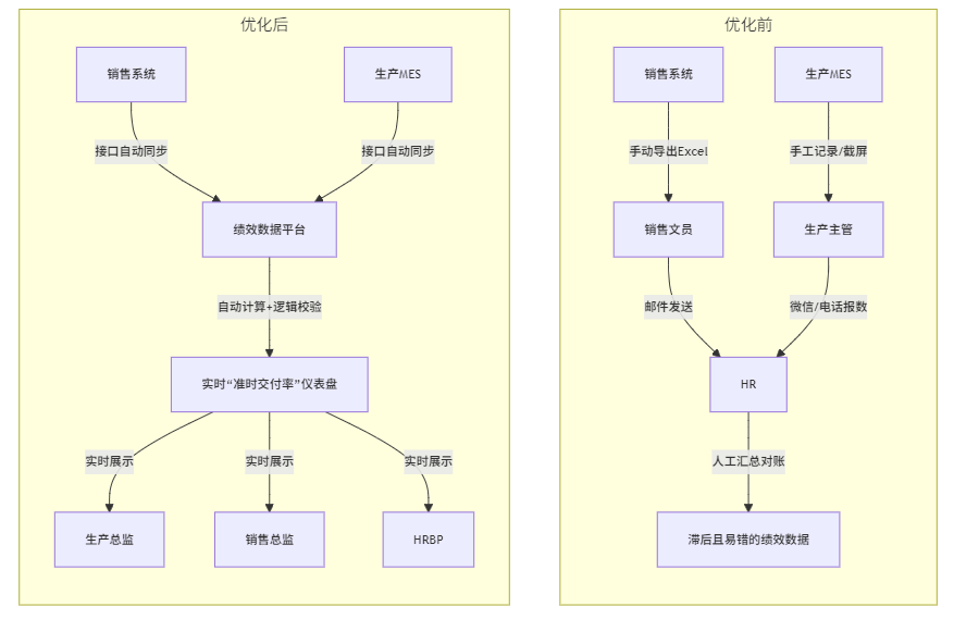 - 绩效平台根据统一公式自动计算“订单准时交付率”等指标;