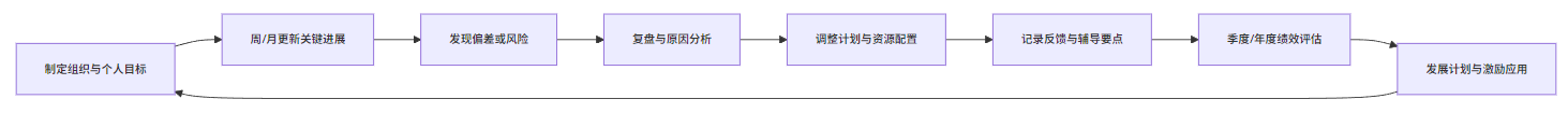 - 季度目标 + 月度检查 + 周/双周例会更新:季度作为正式考核周期,月度和周度用于滚动更新进展和风险;