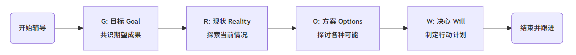 - 不会用结构化方法:比如教练式辅导里常用的GROW模型(目标Goal、现实Reality、方案Options、意愿/行动Will),很多管理者听都没听过,更不用说用在面谈中。