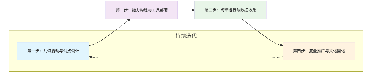 一个相对稳妥、可复制的路径,是分为四个阶段推进:共识启动与试点设计 → 能力构建与工具部署 → 闭环运行与数据收集 → 复盘推广与文化固化。