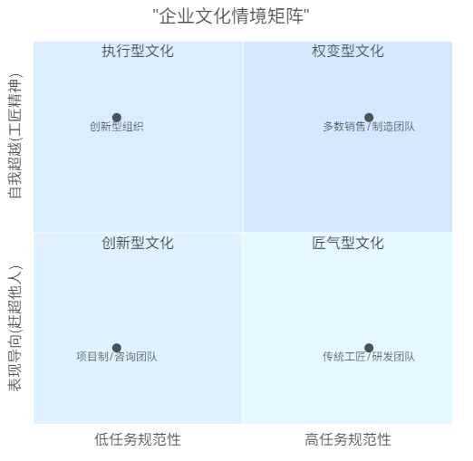 - 匠气型文化(高规范性 + 自我超越):强调标准、专业和持续改善,“把事做到极致”是关键字;