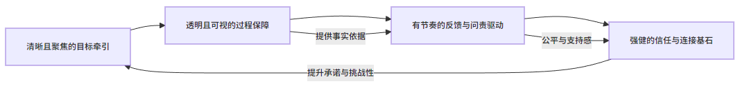 这四个环节构成一个正向增强回路——清晰目标指明方向,可视过程提供事实基础,规律反馈强化承诺与改进,信任文化则为更高标准和更大授权打底。
