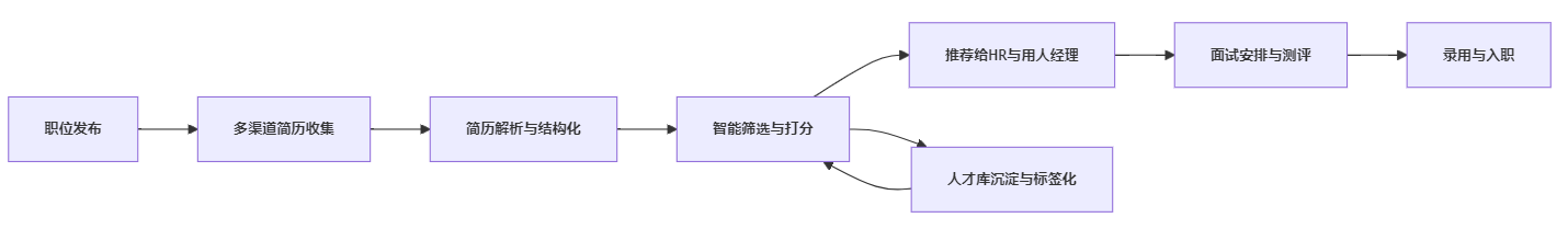 - 简历筛选结果无法直接驱动后续测评、邀约和人才库沉淀。