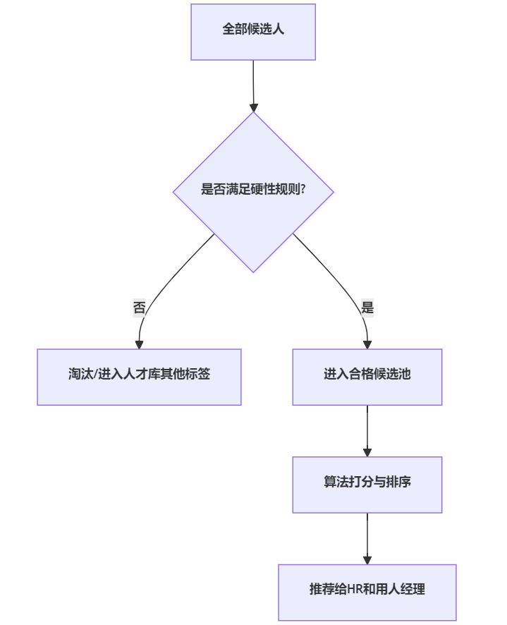 - 规则筛选用于硬条件过滤:如工作地点、是否接受出差、必须持有的证书等;
