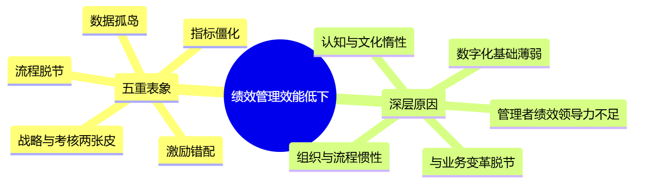 本模块的核心结论是:绩效管理效能低下并非某个环节的偶然失误,而是“组织结构、管理能力、技术基础、文化认知、业务变革节奏”共同作用的结果。可以概括为“三重硬阻”和“两重软肋”。